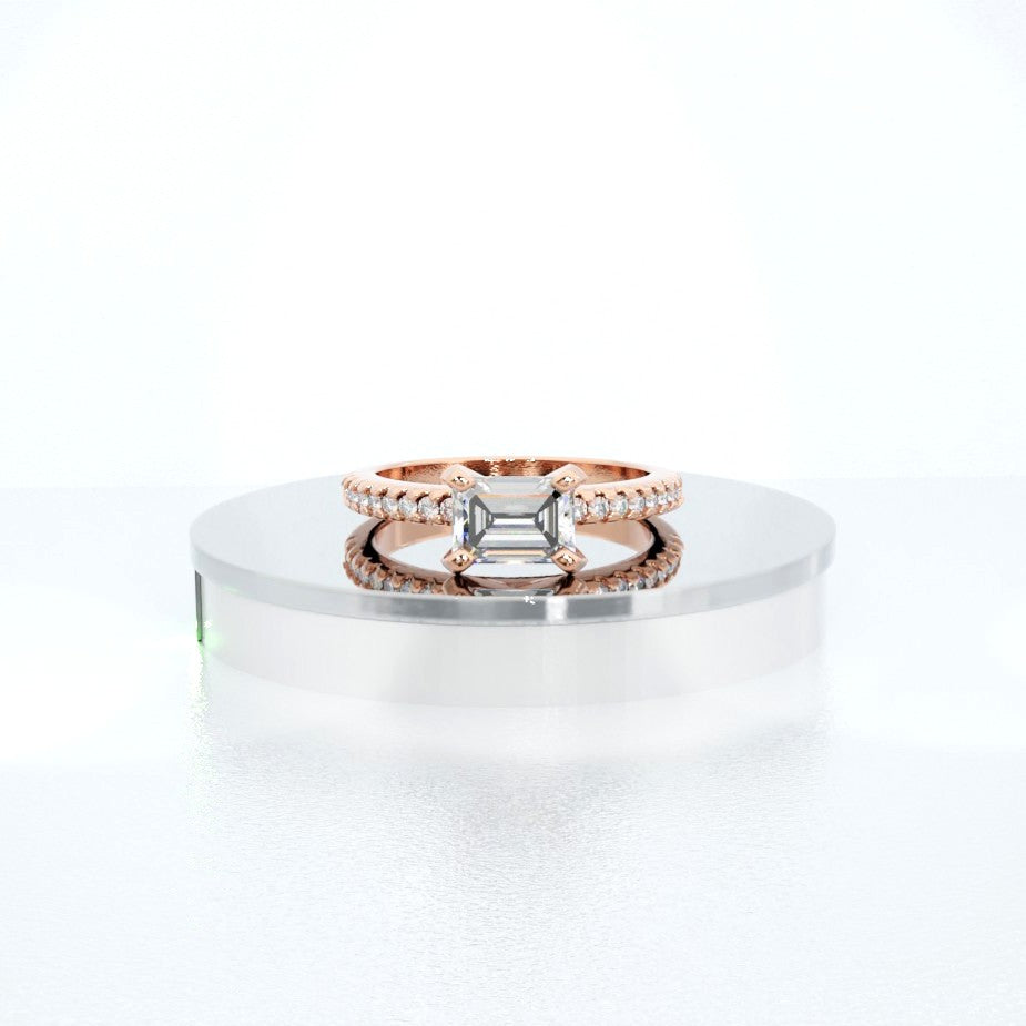 Rose gold engagement ring featuring a bold 1ct emerald cut center diamond and approximately 0.25ctw of accent diamonds. Available in either 10k or 14k rose gold and your choice of natural or lab-created diamonds.